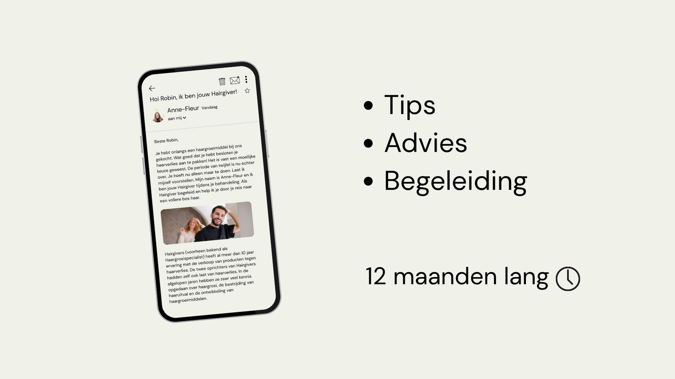 Bij aankoop start automatisch een traject van 12 maanden met persoonlijke ondersteuning. Je ontvangt tips en advies voor een zo effectief mogelijke behandeling en wordt gekoppeld aan een Hairgivers-consultant voor begeleiding en antwoorden op al je vragen.