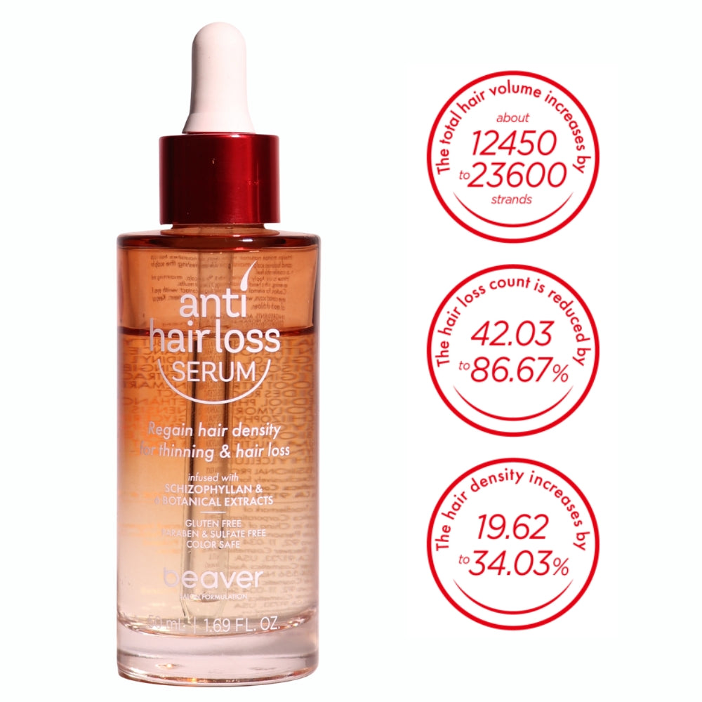 Het Beaver Anti Hair Loss Serum bevat een mix van krachtige botanische extracten, waaronder Biota orientalis (thuja), Polygonum multiflorum (fo-ti), gemberwortel, Panax ginseng, Anemarrhena asphodeloides en Schizophyllan (beta-glucaan).