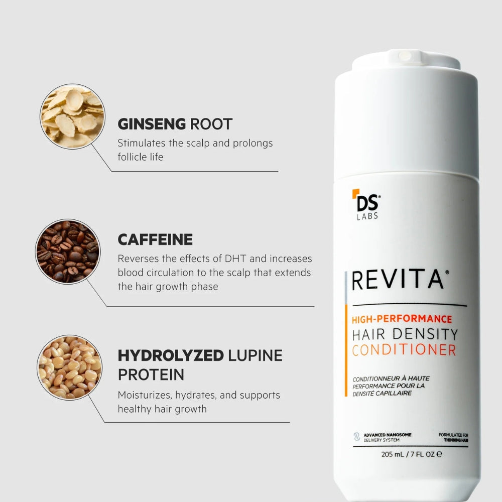 Revita conditioner bevat krachtige ingrediënten die de haargroei stimuleren en het haar voeden en verzorgen. Het bevat een verjongingscomplex en een extract van appelstamcellen die helpen om de follikel te voeden en beschermen, om haaruitval te voorkomen. De actieve ingrediënten zijn ingekapseld in nanosomen om diep in de hoofdhuid te worden opgenomen. Hierdoor werken de ingrediënten 12 uur of langer in de hoofdhuid, zelfs na douchen, zwemmen of zweten.