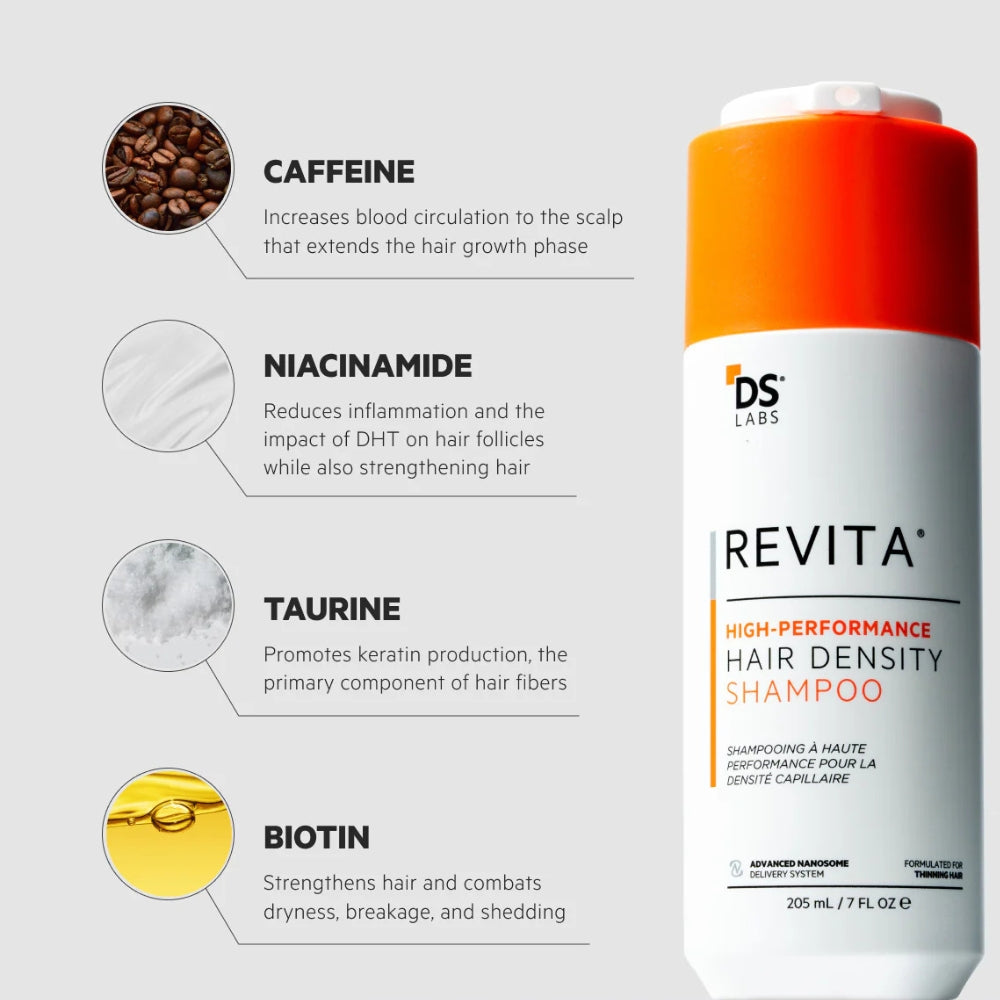 “een van de beste shampoos om haaruitval te voorkomen en behandelen. Het levert cafeïne die de haargroei stimuleert en ook de negatieve effecten van testosteron op de haarzakjes tegengaat. Als je meer haar dan normaal verliest of als je voelt dat je haar dunner wordt, dan is Revita de juiste shampoo voor jou.”